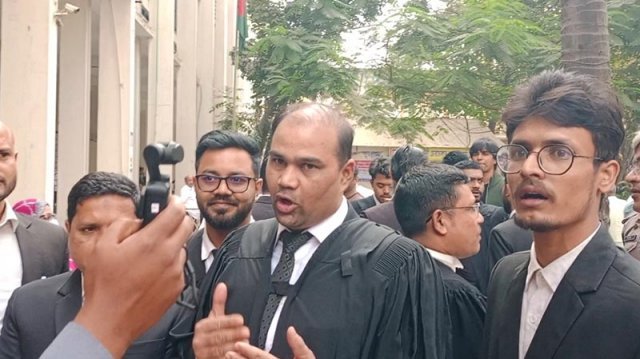 সোমবার (৯ ফেব্রুয়ারি) দুপুরে ঢাকা মহানগর আদালতের সামনে এই ঘটনা ঘটে। এসময় স্লোগান দেন অ্যাডভোকেট মো. গোলাম রাব্বানী ও অ্যাডভোকেট প্রতাপ বাড়ৈসহ বেশ কয়েকজন আইনজীবী। উপস্থিত সাংবাদিকদের তারা বলেন, “আওয়ামী লীগের মতো বড় দলকে বাইরে রেখে কোনও নির্বাচন হতে পারে না। আমাদের নেতাকর্মীদের মিথ্যা মামলায় কারাগারে রাখা হয়েছে। এই প্রহসনের নির্বাচন দেশের মানুষ বয়কট করেছে, আমরাও মানি না।”