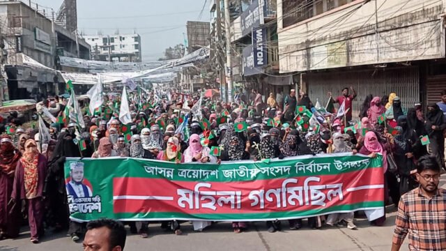 রোববার (৮ ফেব্রুয়ারি) বেলা সাড়ে ১১টায় শহিদ আবরার ফাহাদ স্টেডিয়াম থেকে নারীরা জাতীয় পতাকা ও দাঁড়িপাল্লা হাতে নিয়ে গণমিছিল বের করে দাঁড়িপাল্লার পক্ষে বিভিন্ন স্লোগান দিতে দিতে গণমিছিলটি শহরের প্রধান প্রধান সড়ক প্রদক্ষিণ করে একতারা মোড়ে এসে সমাপ্ত হয়।