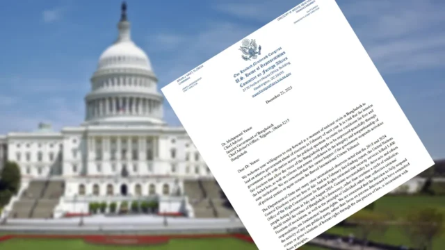 বাংলাদেশে অবাধ, সুষ্ঠু ও অন্তর্ভুক্তিমূলক নির্বাচন নিশ্চিত করার আহ্বান জানিয়ে অন্তর্বর্তী সরকারের প্রধান উপদেষ্টা ড. মুহাম্মদ ইউনূসের কাছে একটি আনুষ্ঠানিক চিঠি পাঠিয়েছেন মার্কিন পার্লামেন্টের নিম্নকক্ষ প্রতিনিধি পরিষদের পাঁচ প্রভাবশালী সদস্য (কংগ্রেসম্যান)।