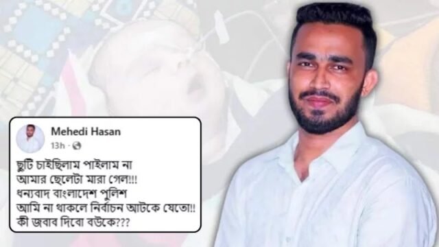 আসন্ন জাতীয় সংসদ নির্বাচনকে কেন্দ্র করে দায়িত্ব পালনের কথা বলে ছুটি না পাওয়ার অভিযোগ তুলে সামাজিক যোগাযোগমাধ্যমে পোস্ট দিয়েছেন বাংলাদেশ পুলিশের সদস্য মেহেদি হাসান। তিনি দাবি করেন, সন্তানের মৃত্যুর মতো ব্যক্তিগত বিপর্যয়ের মধ্যেও তাকে ছুটি দেওয়া হয়নি।