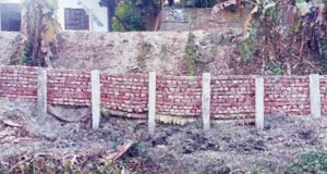 সড়কের গাইডওয়াল নির্মাণে কলাগাছের ওপর ইটের গাঁথুনি!