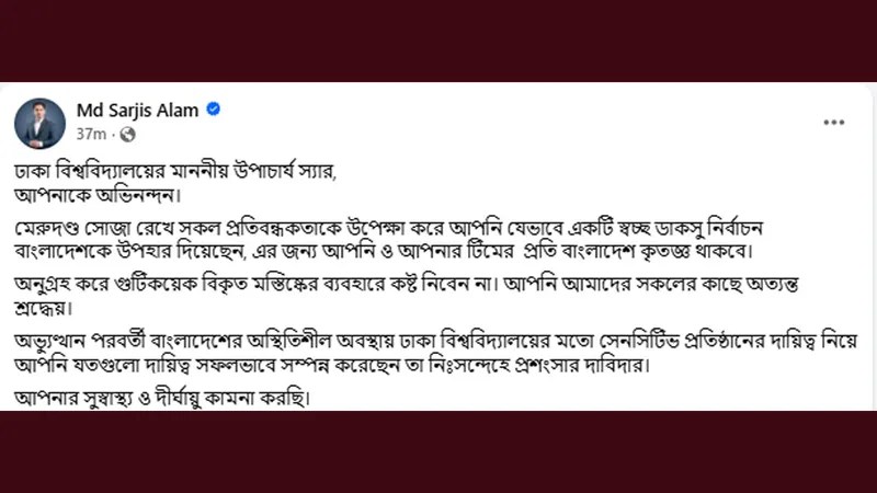 পোস্টে সারজিস আলম লেখেন—ঢাকা বিশ্ববিদ্যালয়ের মাননীয় উপাচার্য স্যার, আপনাকে অভিনন্দন। মেরুদণ্ড সোজা রেখে সব প্রতিবন্ধকতাকে উপেক্ষা করে আপনি যেভাবে একটি স্বচ্ছ ডাকসু নির্বাচন বাংলাদেশকে উপহার দিয়েছেন, এর জন্য আপনি ও আপনার টিমের প্রতি বাংলাদেশ কৃতজ্ঞ থাকবে।
