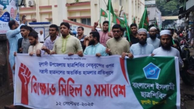 বরিশালের মুলাদীতে নিজ সংগঠনের নেতাকর্মীদের ওপর ছাত্রদলের হামলার প্রতিবাদে বিক্ষোভ মিছিল ও সমাবেশ করেছে ইসলামি ছাত্রশিবির। শুক্রবার (১২ সেপ্টেম্বর) বেলা ১১টার দিকে উপজেলা ও মুলাদী সরকারি কলেজ ছাত্রশিবিরের আয়োজনে অনুষ্ঠিত এ বিক্ষোভ মিছিলে উপস্থিত হয়ে তিনি ওই হুঁশিয়ারি দেন।