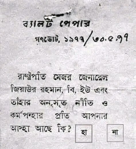 ১৯৭৭ সালের প্রেসিডেন্ট জিয়াউর রহমানের গণভোটে মানুষের আস্থা ছিল ‘হ্যাঁ’-এর প্রতি। এবারও সেটা ‘হ্যাঁ’- হবে…