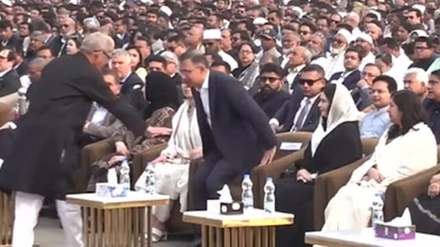 এ সময় দেখা যায়, তারেক রহমান আসন ছেড়ে উঠতে উঠতেই তাকে মির্জা ফখরুল বারবার বসার অনুরোধ জানান। একপর্যায়ে তিনি নিজে সামনে এগিয়ে গিয়ে তারেক রহমানকে হাত ধরে আসনে বসান।
