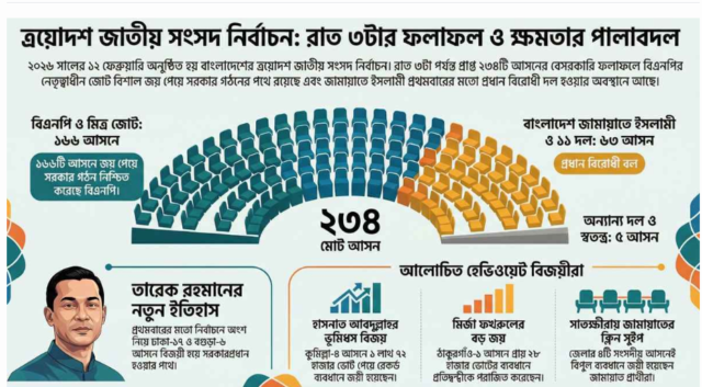 এর মধ্য দিয়ে নিশ্চিত হয়ে গেছে, বিএনপির নেতৃত্বেই গঠিত হতে যাচ্ছে বাংলাদেশের আগামী সরকার। ফলে, প্রথমবারের মতো জাতীয় সংসদ নির্বাচনে অংশ নিয়েই সরকারপ্রধান হওয়ার দ্বারপ্রান্তে দাঁড়িয়ে আছেন বিএনপি চেয়ারম্যান তারেক রহমান। আর বাংলাদেশের সংসদের ইতিহাসে প্রথমবারের মতো বিরোধী দল হতে যাচ্ছে জামায়াত।