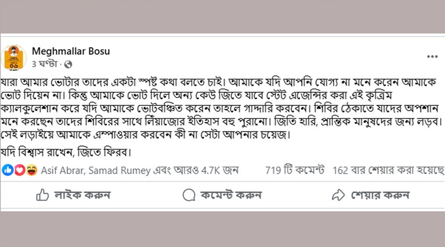 সোমবার (৮ সেপ্টেম্বর) দিবাগত মাঝরাতে নিজের ফেসবুক আইডিতে এক পোস্টের মাধ্যমে এ বার্তা দেন তিনি। পোস্টে মেঘমল্লার লিখেছেন, ‘যারা আমার ভোটার তাদের একটা স্পষ্ট কথা বলতে চাই। আমাকে যদি আপনি যোগ্য না মনে করেন, আমাকে ভোট দিয়েন না। কিন্তু আমাকে ভোট দিলে অন্য কেউ জিতে যাবে স্টেট এজেন্সির করা এই কৃত্রিম ক্যালকুলেশান করে যদি আমাকে ভোটবঞ্চিত করেন, তাহলে গাদ্দারি করবেন।’তিনি আরও লেখেন, ‘শিবির ঠেকাতে যাদের অপশান মনে করছেন, তাদের শিবিরের সাথে লিঁয়াজোর ইতিহাস বহু পুরানো। জিতি-হারি, প্রান্তিক মানুষদের জন্য লড়ব। সেই লড়াইয়ে আমাকে এম্পাওয়ার করবেন কি না, সেটা আপনার চয়েজ। যদি বিশ্বাস রাখেন, জিতে ফিরব।’