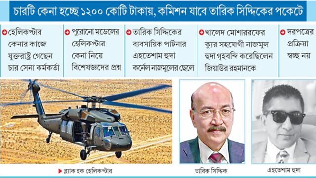 জানা গেছে, শেখ হাসিনার বিগত ফ্যাসিস্ট সরকার ক্ষমতায় থাকতেই তারিক সিদ্দিক ও এহতেশাম হুদা বাংলাদেশ সেনাবাহিনীর জন্য ‘ব্ল্যাক হক’ নামক ‘অ্যাটাক’ হেলিকপ্টার আনার পাঁয়তারা শুরু করেন। এজন্য তাদের কোম্পানি নিজেদের মতো টেন্ডার ডকুমেন্ট তৈরি করে। পরবর্তী সময়ে ২০২৪ সালের ৫ আগস্ট শেখ হাসিনার পতন হলে ওই মহলটি কিছুদিন চুপ থেকে পুনরায় এই কাজ পাওয়ার জন্য নীলনকশা তৈরি করে।
