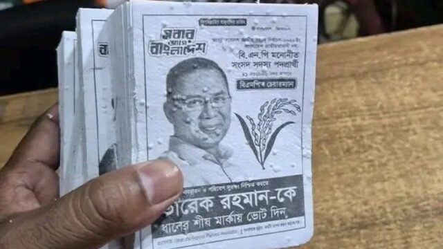 বগুড়া-৬ (সদর) আসনে ধানের শীষের সমর্থনে বিএনপি চেয়ারপার্সন তারেক রহমানের নির্বাচনী প্রচারণায় এক অভিনব ও পরিবেশবান্ধব উদ্যোগ লক্ষ্য করা গেছে। প্রচারণার কাজে সাধারণ কাগজের পরিবর্তে ব্যবহার করা হচ্ছে বিশেষ ‘বনকাগজ’ বা ‘সিড পেপার’ দিয়ে তৈরি লিফলেট, যা স্থানীয় ভোটারদের মধ্যে ব্যাপক কৌতূহল ও প্রশংসা জাগিয়েছে।