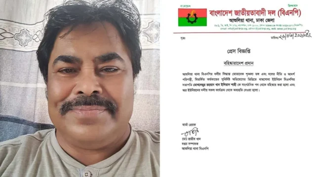 বহিষ্কার হওয়া মোখলেছুর রহমান খান ইলিয়াস শাহী আশুলিয়া থানার ধামসোনা ইউনিয়ন বিএনপির সভাপতি।