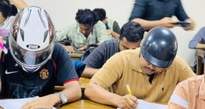 নিরাপত্তা শঙ্কায় হেলমেট পরে পরীক্ষার হলে জবি শিক্ষার্থীরা
